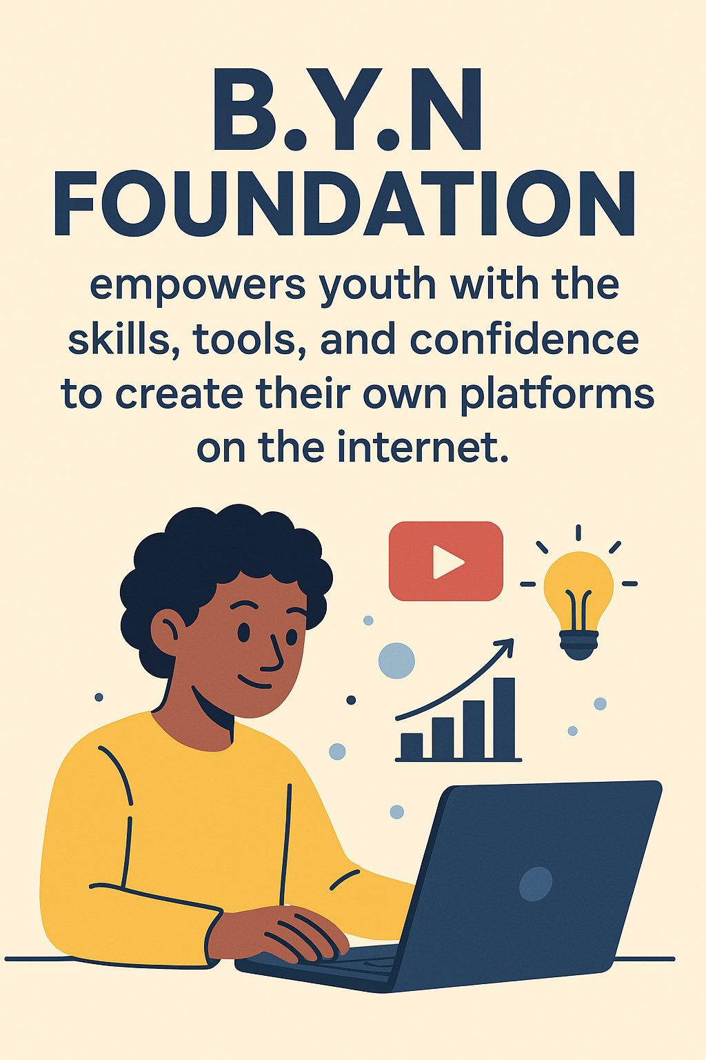 Our non-profit organization is dedicated to driving meaningful change by leveraging resources and expertise to support impactful initiatives. B.Y.N Foundation exists to empower youth with the skills, tools, and confidence to create their own platforms on the internet. We help kids turn creativity into entrepreneurship by teaching digital literacy, online branding, and revenue generation, ensuring every young voice has a chance to be heard.